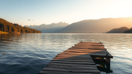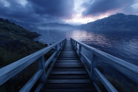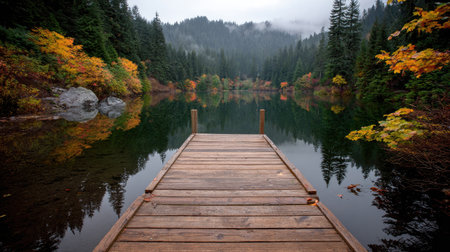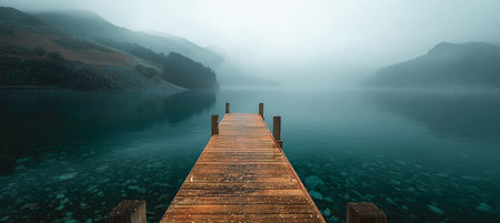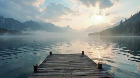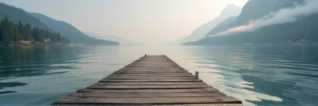 A serene wooden dock stretches over a calm lake, surrounded by misty mountains during dawn.