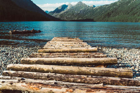 Wooden jetty on the shore of mountain lake. Summer landscape