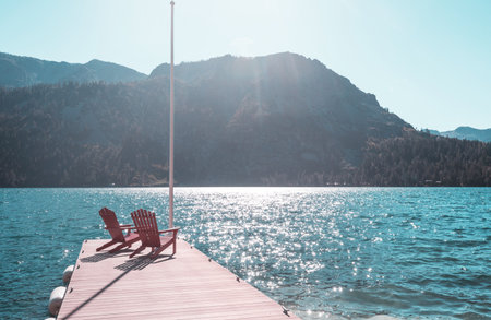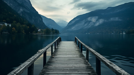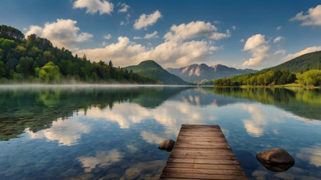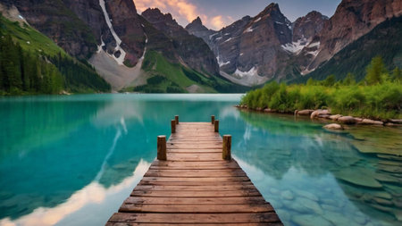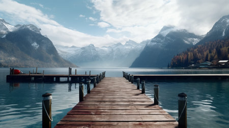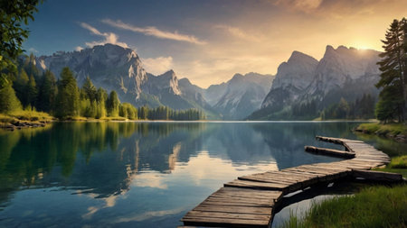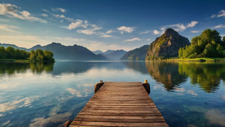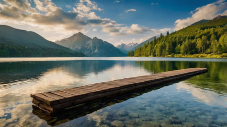 Alpine Serenity: Tranquil Waters, Majestic Mountains, and a Wooden Jetty.