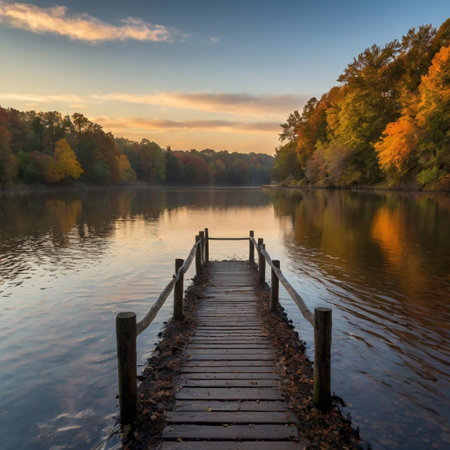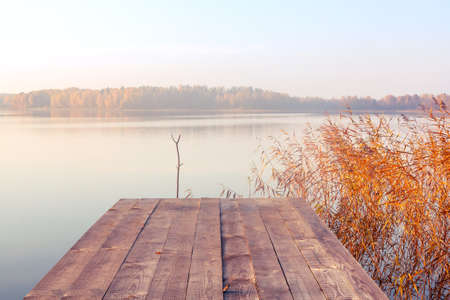 Wooden pier on a lake at sunrise. Beautiful autumn landscape.