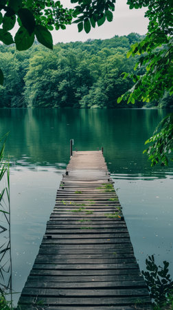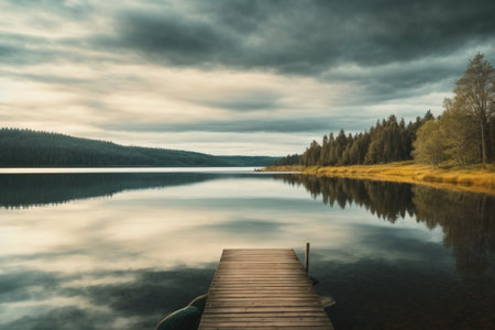 Rustic Wooden Dock Overlooking a Serene Calm Lake Under a Soft Overcast Sky