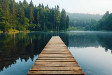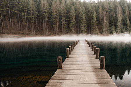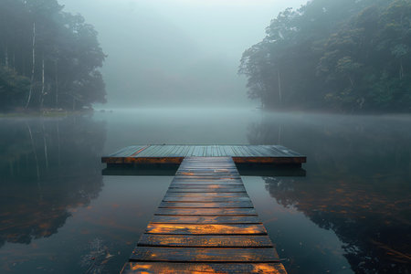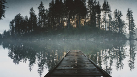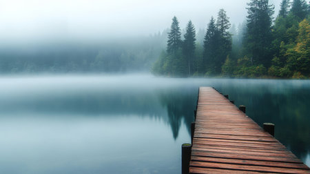 Tranquil Mist-Covered Lake with Wooden Dock Surrounded by Dense Forest. Concept of Nature Serenity, Peaceful Reflection, Morning Mist, Calm Wilderness. Banner.