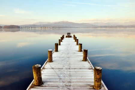 Jetty At Windermere, English Lake District, Cumbria, England, extending out in to a peaceful lake with distant hills.