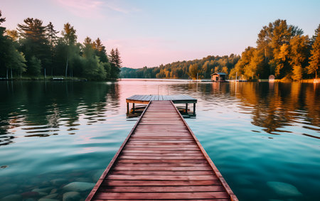 Wooden pier on a lake at sunset with a forest in the background