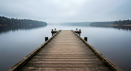 Peaceful Wooden Dock Extending into a Still Overcast Lake with Muted Reflections