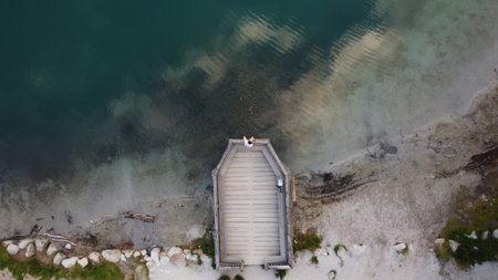 An aerial view of a sea with a wooden walkway
