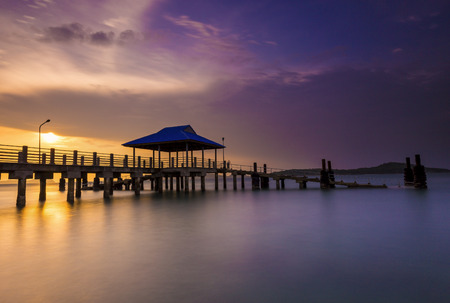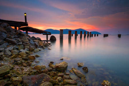 Beautiful sunset view over calm water of an abandoned jetty in Bagan Sungai Burong, Malaysia because of erosion