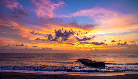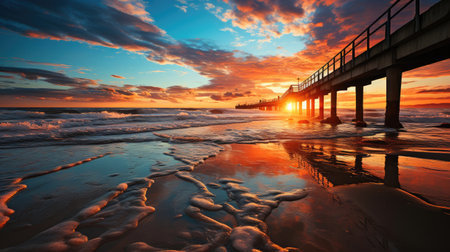 A beautiful sunset casts a warm glow over the ocean as waves gently lap against the pier. The horizon is adorned with vibrant hues, creating a serene atmosphere.