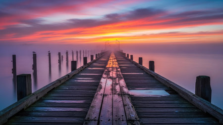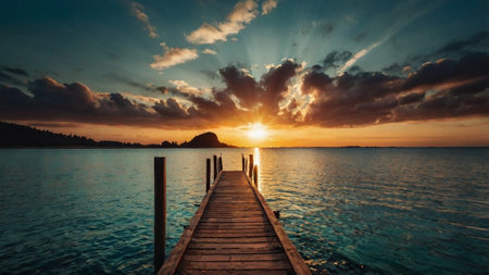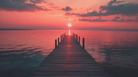 The tranquil dock emerges from the calm water as the sun rises, casting vibrant hues across the horizon. Morning light creates a serene atmosphere ideal for reflection. Generative AI.