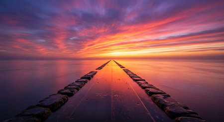 Serene ocean sunset with vibrant sky by wooden pier.