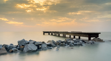 Wooden pier on the sea at sunset with beautiful sky background.
