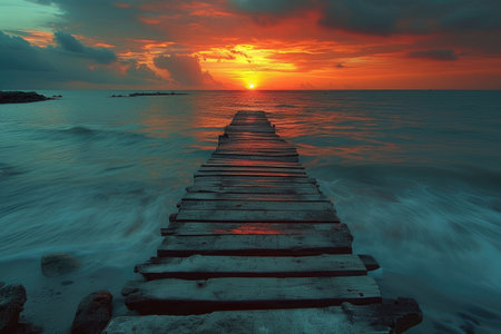 A wooden pier stretches toward the horizon under a colorful sunset. The image displays a long exposure shot, showcasing the textured wood and soft water reflections. The sky transitions from fiery oranges and reds to softer blues and purples, creating a serene environment suitable for various commercial or artistic projects.