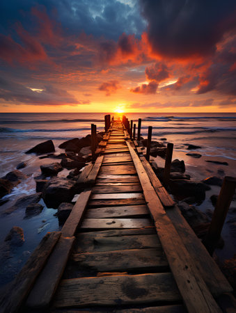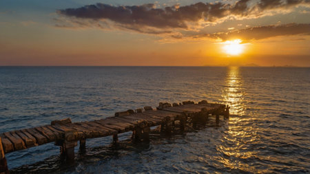 Wooden pier at sunset with beautiful sky and sea in the background