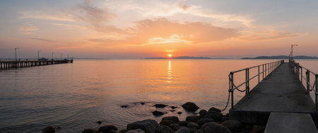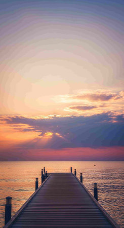 A captivating view of a wooden pier stretching into tranquil waters at sunset, with soft pastel skies and gentle reflections, creating a peaceful and calming atmosphere.