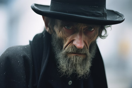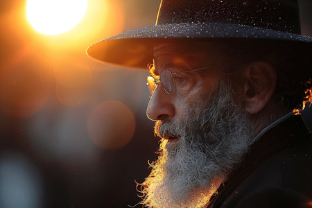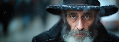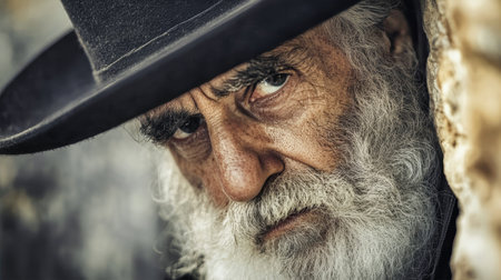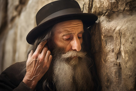 Elderly man with beard and wide-brimmed black hat stands against ancient stone architecture reflecting Jewish cultural heritage, national identity, wisdom, resilience, tradition and timeless legacy