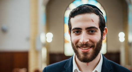 Young jewish man smiling in synagogue with stained glass background for cultural or religious context design
