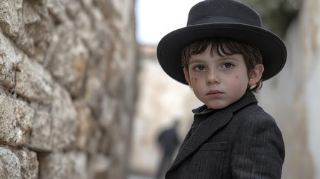 A young boy stands alone in a narrow alley surrounded by aged stone walls. Dressed in period clothing and a hat, he gazes thoughtfully into the distance, evoking a sense of nostalgia and curiosity about his surroundings during the late afternoon.