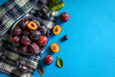Overhead still life of purple plums in basket on blue textured background with copy space