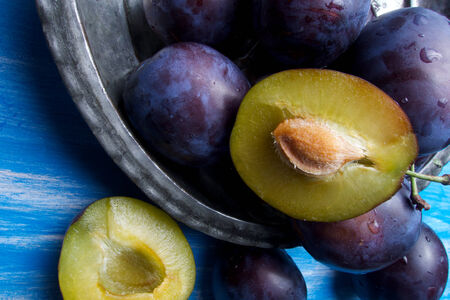 Purple fresh raw plums in silver vintage bowl