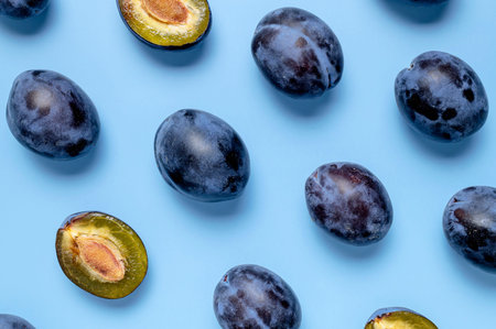 Fresh ripe plum on blue background flat lay top view copy space. Plum whole and halves, plum abstract background. Fruit tropical pattern. Food, healthy organic food. harvest concept.