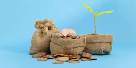 Currency investing concept. Top view, fibre plant pots with growing money.