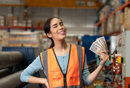 Portrait of an Asian woman with the emotions that arise with the money received as wages working in the warehouse.