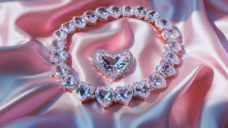 A stunning arrangement of heart-shaped gemstones and jewelry on soft pink satin fabric, showcasing elegance and luxury. Perfect for romantic themes!