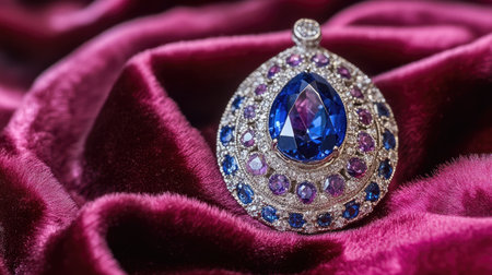 A captivating blue sapphire brooch adorns a plush velvet backdrop, showcasing exceptional craftsmanship and luxurious elegance. Perfect for fashion enthusiasts.