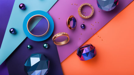 Colorful jewelry pieces including rings and gems displayed on a geometric background with vibrant colors, perfect for fashion and accessories themes.