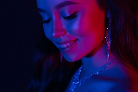 Portrait of beautiful woman in neon light. Party. Jewerly on her neck. Celebrating.