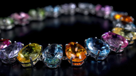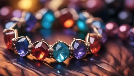 This captivating image features a stunning bracelet adorned with sparkling gemstones. The colorful reflections create a mesmerizing effect against the dark background, highlighting the intricate craftsmanship and luxurious appeal of the jewelry piece. Perfect for fashion and accessory blogs.