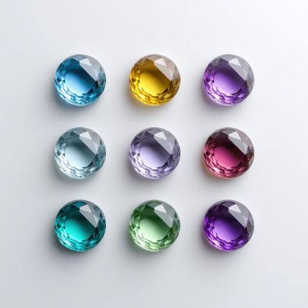 Colorful Gemstones Displayed in a Grid Pattern, Featuring Various Shapes and Cuts, Reflecting Light in a Bright Studio Setup