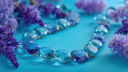 This captivating image features a stunning blue gemstone necklace elegantly placed among vibrant purple flowers, set against a tranquil turquoise backdrop, perfect for showcasing luxury and beauty.