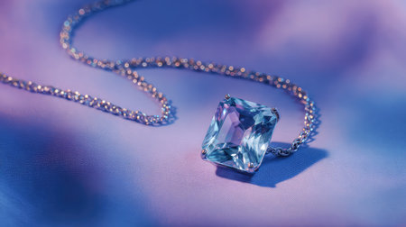 A stunning close-up of a blue gem necklace with a silver chain, set against a softly lit purple backdrop, perfect for showcasing elegance and fashion in jewelry photography.