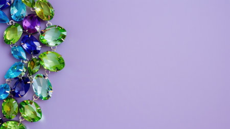 This image showcases a stunning arrangement of multicolored gemstones featuring vivid greens, blues, and purples on a soft lavender background. Perfect for design projects.