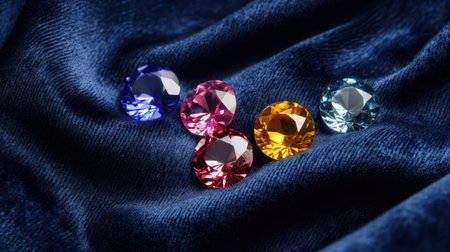 Cluster of round brilliant gems of all colors spread over navy velvet