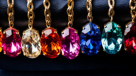 A stunning array of colorful gemstones arranged in a line, showcasing their vibrant hues and brilliant facets, creating mesmerizing reflections and shadows.