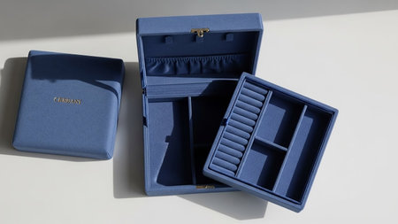 An open blue jewelry box with a removable tray sits next to a closed matching box.