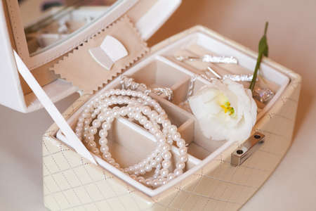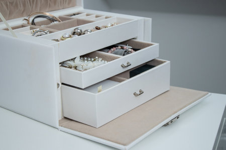 Close up of different bijouterie in a white leather jewellery box