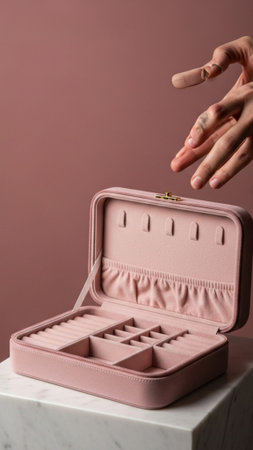 A tall, vertical editorial photograph (9:16) capturing a luxurious pink velvet jewelry storage box f