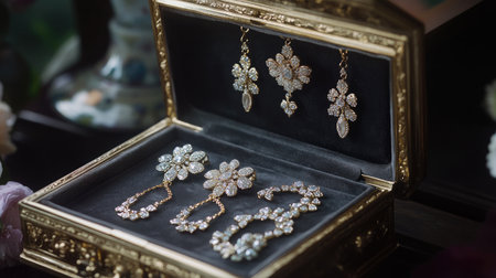 This exquisite vintage jewelry display showcases sparkling earrings with a floral design, elegantly arranged in a luxurious box, perfect for special occasions.