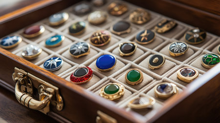 A stunning display of elegant jewelry pieces in an antique box, featuring a variety of exquisite designs with intricate details and sparkling gems.