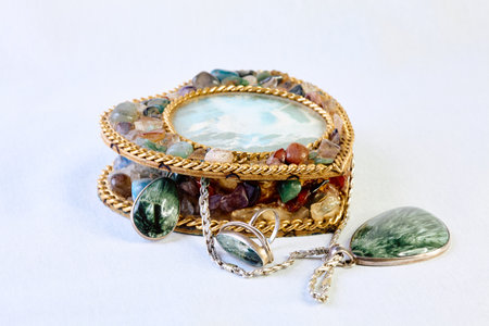 Antique handmade jewelry box with ornaments, chain, pendant and rings