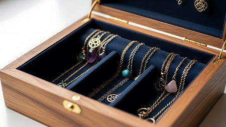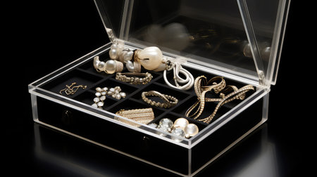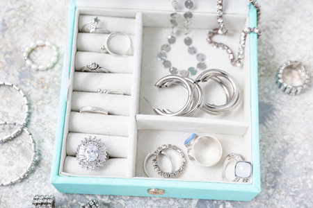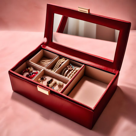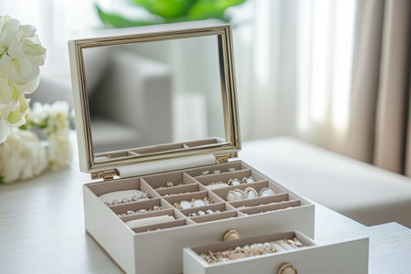Exquisite jewelry box showcasing an elegant collection of rings, necklaces, and earrings in a stylish living room