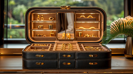 Elegant jewelry box displays assorted rings, earrings, and necklaces in a modern living space with natural light