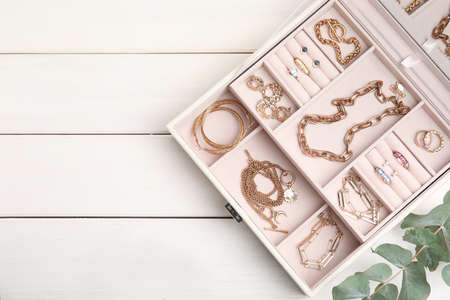 Jewelry box with stylish golden bijouterie on white wooden table, flat lay. Space for text