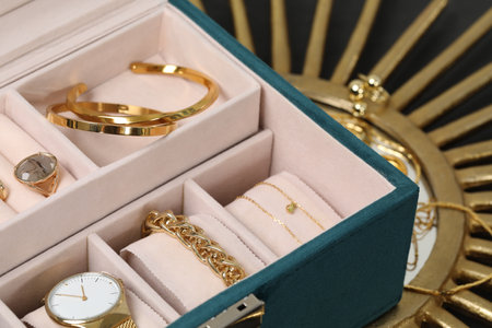 Elegant jewelry box with beautiful bijouterie, closeup