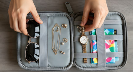 Top-down view of hands organizing small travel essentials into a grey pouch. The items include sunglasses, necklaces, a watch, and a cleaning cloth, showcasing travel preparation.