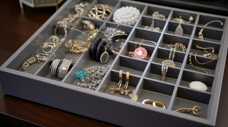 Discover a beautiful organized jewelry drawer featuring a variety of elegant accessories including rings, earrings, and bracelets in a stylish wooden box.