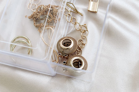 Gold jewelry earrings bracelets in a transparent organizer